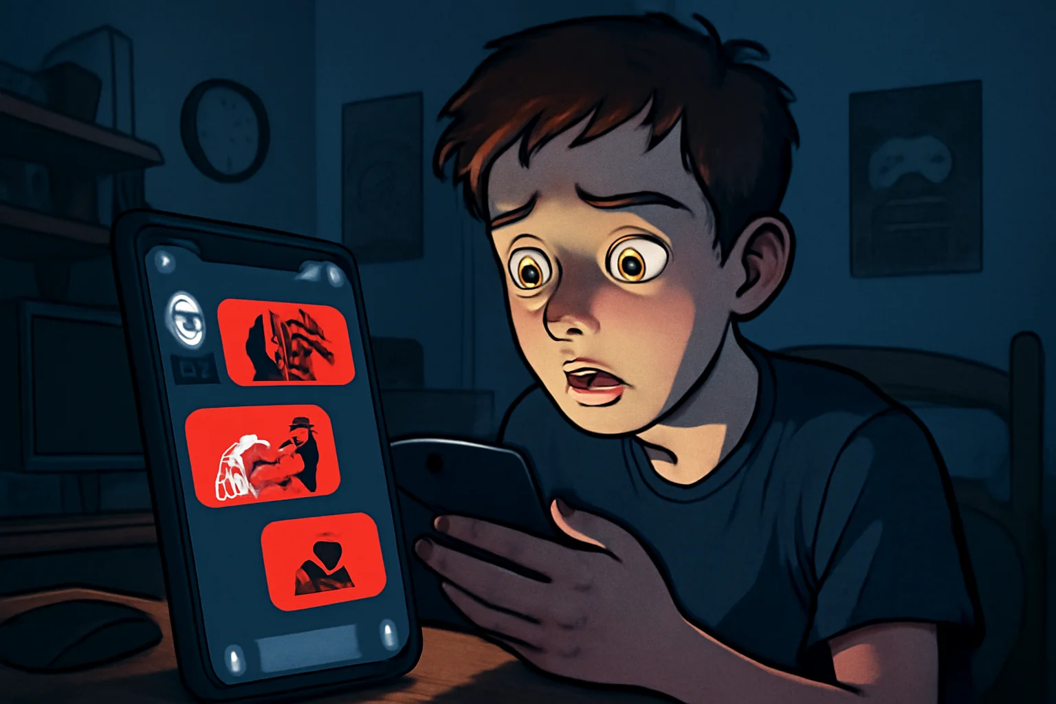 Imagem de adolescentes em uma sala observando uma tela de chat violenta, destacando o alerta 42 jovens usam IA como companhia