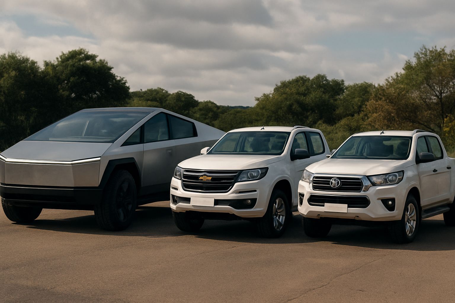 • Motorização: Cybertruck (857 cv, elétrico) vs. Ford F-150 (405 cv, a combustão) vs. Toyota Hilux (a partir de 177 cv, a diesel) vs. Fiat Toro (a partir de 120 cv, a diesel/flex).